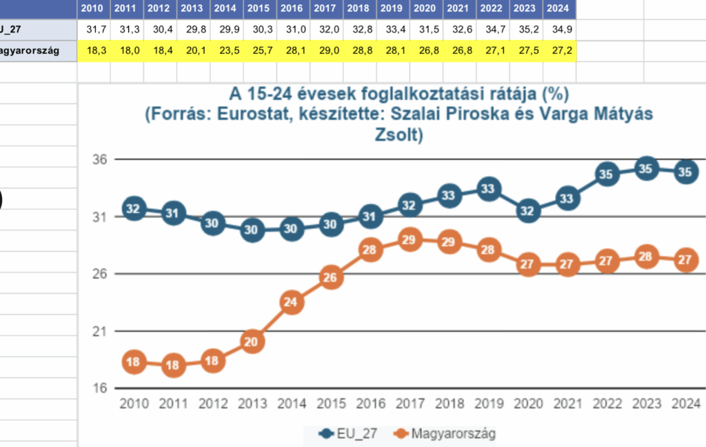 A 2010-es 18,3 százalékról ugyan 2024-re 27,2 százalékra emelkedett hazánkban a 15-24 évesek foglalkoztatási rátája, így az utolsó helyről a 17. helyre tudtunk előre lépni a tagállamok között, a 34,9 százalékos uniós átlagtól azonban még mindig el vagyunk maradva – állapította meg a tanulmány.