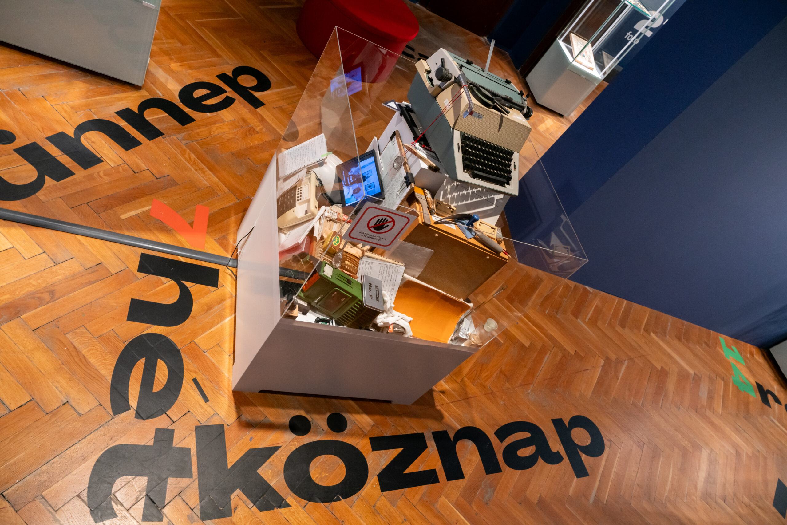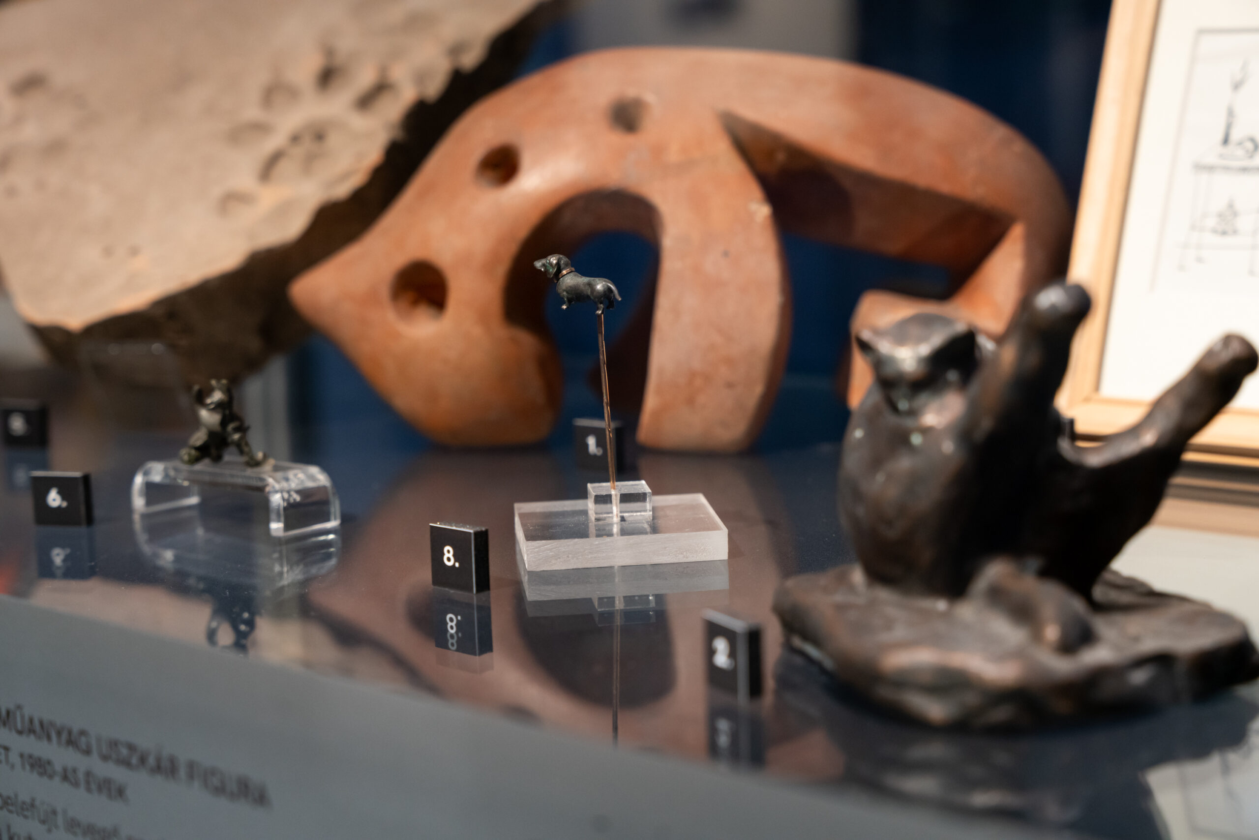 S hogy mi látható még előtte? Mementója annak, hogy 1986-ban az Országzászló téri kiállítóhelyen forgatták a Linda című nyomozós magyar filmsorozat egyik epizódját, egy edényekkel teli vitrin, amely ünnepi, étkezéssel kapcsolatos tárgyakat mutat be, s 7000 évet ölel át, egy őstulok jobb szarva, egy kanászkürt, egy türelemüveg, madarak, ékszerek, kalapok, plakátok és újságcikkek, könyvek, bizarr és cuki tárgyak, bajuszos bácsitól, dinoszaurusz-faragványtól és magyaros motívumoktól ékes borotválkozó tükör, nyílvégek, Benczúr Emese hímzése egy MÁV-os függönyre, amelyen végtelenítve olvasható, hogy „Munka közben az utazásra gondolok”. Hiába, nem tudjuk felsorolni mindet.