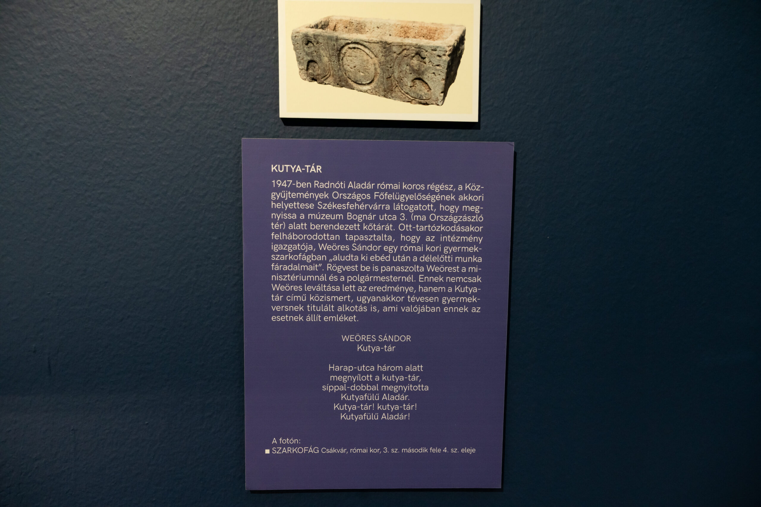 „Weöres Sándor 1947-ben volt igazgató a fehérvári múzeumban, de leginkább verselgetett, iszogatott, pihengetett. Amikor Radnóti Aladár, a Közgyűjtemények Országos Főfelügyelőségének helyettese Fehérvárra jött egy kőtárnyitóra, Weöres Sándort egy római gyermekszarkofágban találta sziesztázni. Nagyon gyorsan megszűnt Weöres Sándor múzeumi munkája, viszont megírta a Kutya-tár című verset”