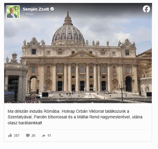 „Ma délután indulás Rómába. Holnap Orbán Viktorral találkozunk a Szentatyával, Parolin bíborossal és a Máltai Rend nagymesterével, utána olasz barátainkkal!” – írta közösségi oldalán vasárnap Semjén Zsolt miniszterelnök-helyettes, a KDNP elnöke. – olvasható a KDNP oldalán.
