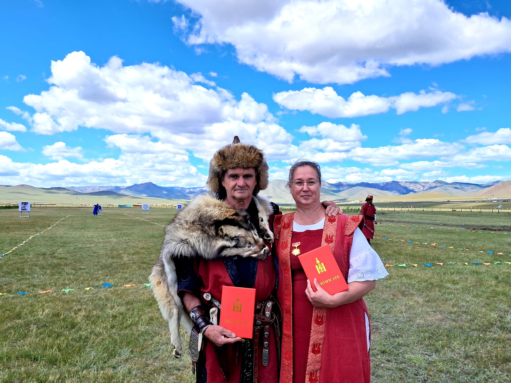 – Most a feleségem van velem, aki Mongóliában maga is versenyzett. Most pedig kijött erre a magyar fesztiválra, ő tanítónő; a gyerekeknek, a magyar gyerekeknek szeretne a múlt időszakából, a honfoglalás korából adni egy ízelítőt kézművességből, ötvösségből. A gyerekek számára is érthetően magyarázza el és mutatja meg, hogy készültek például a hajfonatkorongok vagy éppen a tarsolylemezek.