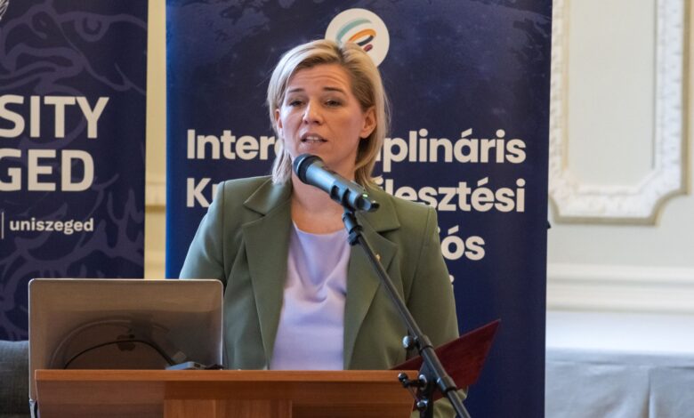 Vezetőkép: Varga-Bajusz Veronika, a Kulturális és Innovációs Minisztérium felsőoktatásért, szak- és felnőttképzésért, fiatalokért felelős államtitkára köszöntőt mond a Szegedi Tudományegyetem (SZTE) innovációs napján az egyetem rektori épületének dísztermében 2025. november 17-én. Fotó: MTI/Oláh Tamás