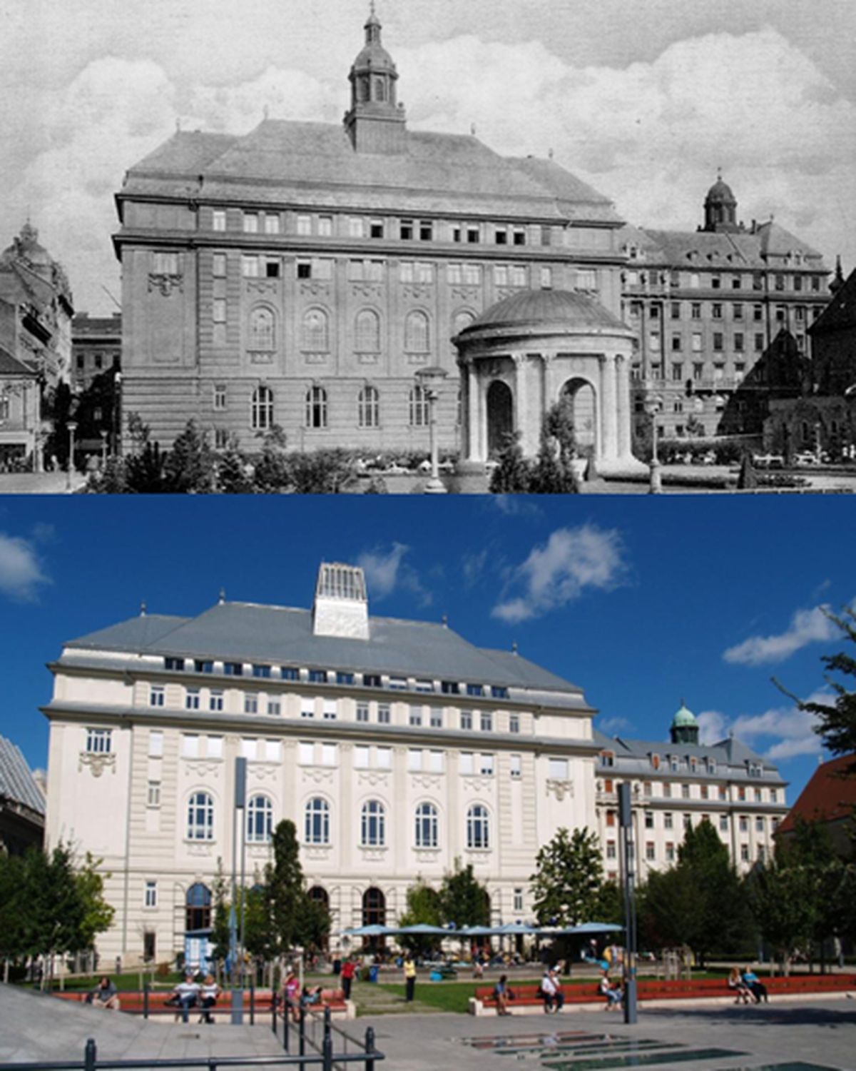Vezetőkép: Végül láthatóvá vált Hült Dezső nagyszerű alkotása a páratlanul szép kupolákkal. Előtérben Erzsébet királyné szobra fölé emelt Gloriett látható, a kép bal felső sarkában pedig a Szapáry-palota kupolás épülete. Forrás: www.kaava.hu
