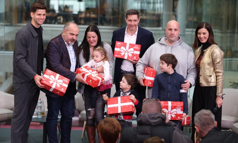 Vezetőkép: Szilágyi Béla, a Baptista Szeretetszolgálat elnöke (b2) ajándékot ad át Ambrus-Tóth Ildikó négygyermekes anyukának (b2), férjének, Ambrus Szabolcsnak (j2) és gyermekeiknek a Baptista Szeretetszolgálat és a MOL közös sajtóeseményén, amelyen elindították a szeretetszolgálat országos cipősdoboz-akcióját, adománygyűjtő kampányát 2025. november 24-én. Balról Siklósi Gergely olimpiai bajnok párbajtőrvívó (b), Pantl Péter, a MOL kommunikációs igazgatója (b4) és Ördög Nóra műsorvezető. Forrás: Baptista Szeretetszolgálat