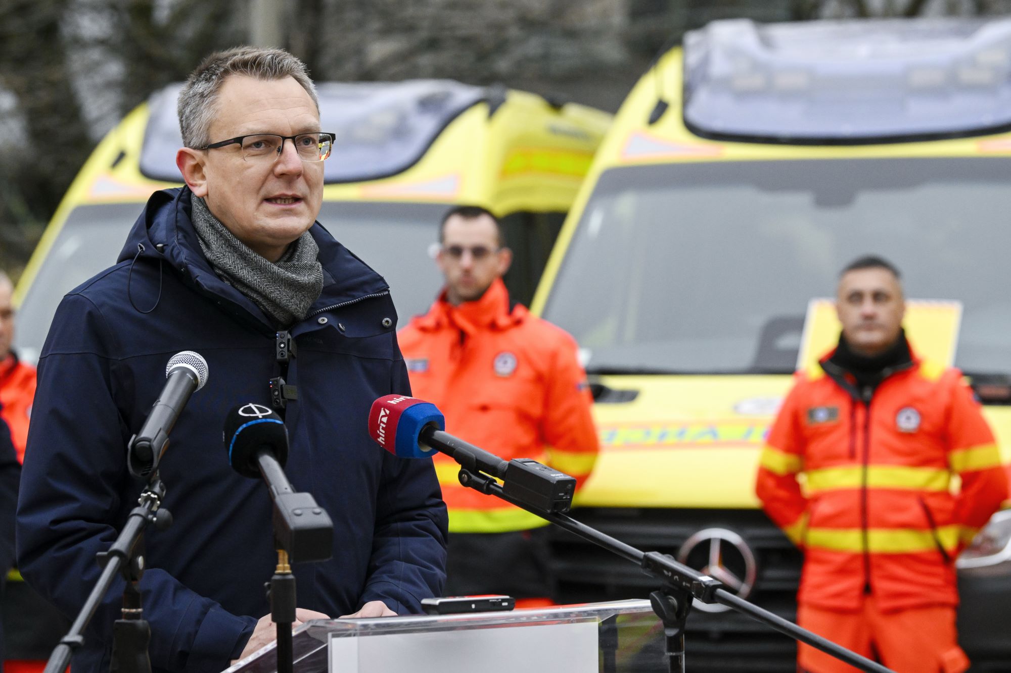 Vezetőkép: Rétvári Bence, a Belügyminisztérium parlamenti államtitkára beszédet mond az új mentőautók átadásán az Országos Mentőszolgálat budapesti bázisán 2025. december 17-én. Mögötte Csató Gábor, az OMSZ főigazgatója (j) és Győrfi Pál, az OMSZ szóvivője. Az idén vásárolt 101 új, korszerű mentőautóból újabb 43 áll szolgálatba az országban. Fotó: MTI/Purger Tamás