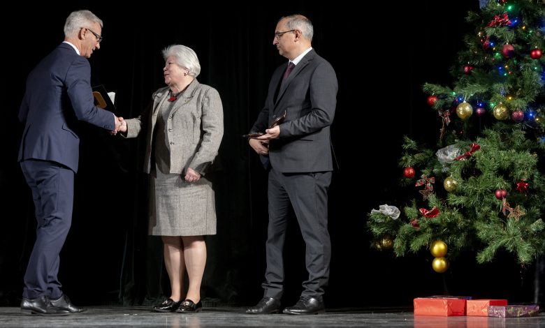 Vezetőkép: Soltész Miklós, a Miniszterelnökség egyházi és nemzetiségi kapcsolatokért felelős államtitkára (b) és Sztojka Attila, a Belügyminisztérium társadalmi esélyekért és roma kapcsolatokért felelős államtitkára (j) átadja a nemzetiségek napja alkalmából a Dnipro Országos Ukrán Kulturális Egyesületnek adományozott Nemzetiségekért díjat Zakar Irinának, az egyesület elnökének a díjátadó ünnepségen a fővárosi Bolgár Művelõdési Házban 2025. december 18-án. Fotó: MTI/Kocsis Zoltán