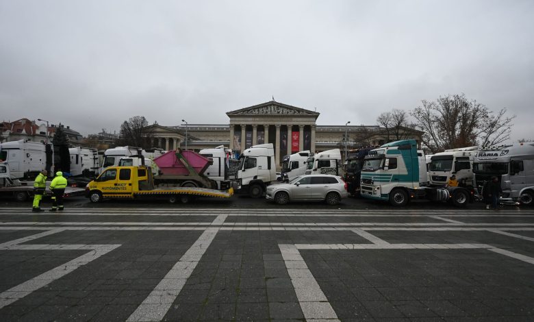 Vezetőkép: A fuvardíjak emelése ellen tüntető kamionosok gépjárművei sorakoznak a fővárosi Hősök terén 2025. december 22-én. Az Építési és Közlekedési Minisztérium december 19-én hét fuvarozói szervezet képviselőivel írt alá megállapodást; minden fuvarozói szervezettel megegyezett, egy szervezet kivételével. A minisztérium tájékoztatása szerint a megállapodás aláírásával a fuvardíjak méltányos emelése valósul meg 2026-ban. Fotó: MTI/Balogh Zoltán