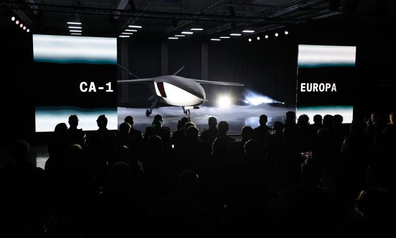 Vezetőkép: A CA-1 Europa új harci drón bemutatója a bajorországi Tussenhausenben 2025. szeptember 25-én. Az MI-technológiára specializálódott német fegyvergyártó vállalat, a Helsing a négytonnás tanulmánydrónt európai partnercégekkel kívánja továbbfejleszteni, hogy 2027-ben röpképes legyen, négy éven belül pedig elkezdődhessék a sorozatgyártása. Fotó: MTI/EPA/Szilágyi Anna