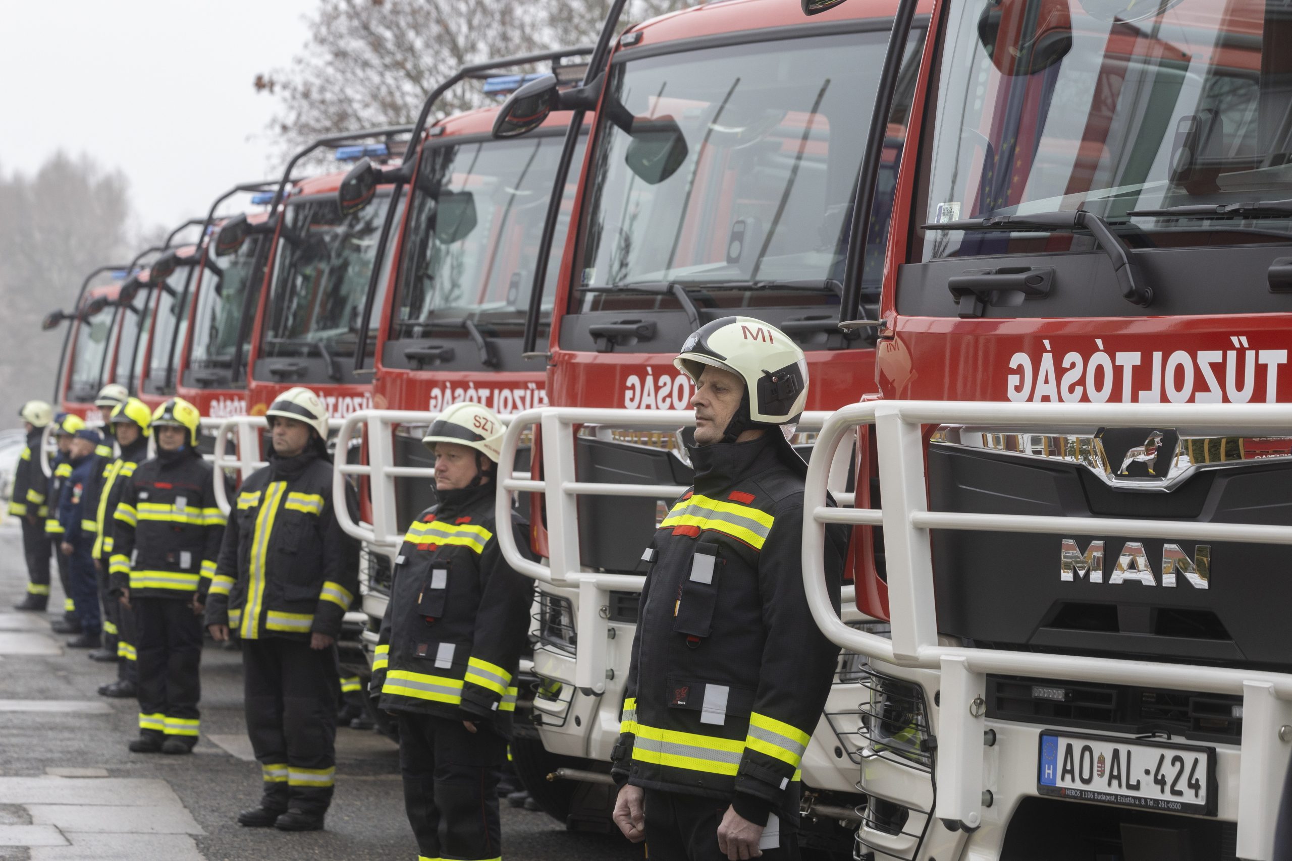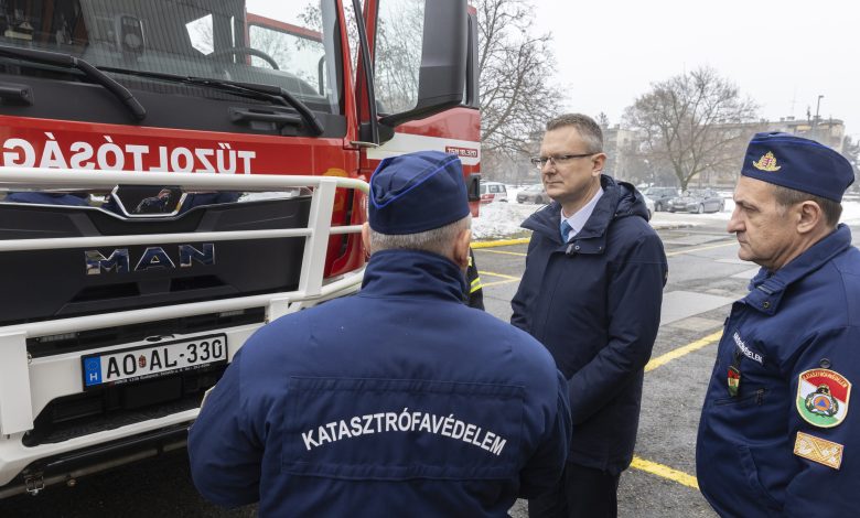 Vezetőkép: Rétvári Bence, a Belügyminisztérium parlamenti államtitkára (k) és Góra Zoltán tűzoltó altábornagy, a BM Országos Katasztrófavédelmi Főigazgatóság főigazgatója (j) a katasztrófavédelemhez érkezett tíz új tűzoltóautó átadásán a BM Országos Katasztrófavédelmi Főigazgatóság budapesti Mogyoródi úti épületénél 2026. január 16-án. Fotó: MTI/Kocsis Zoltán