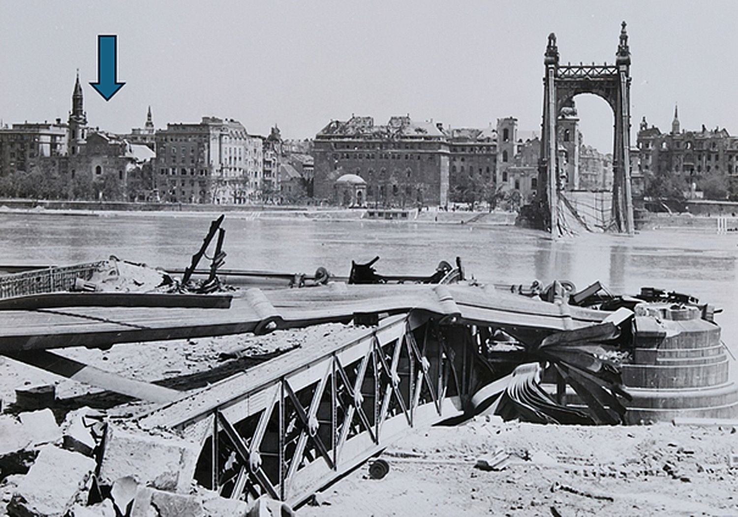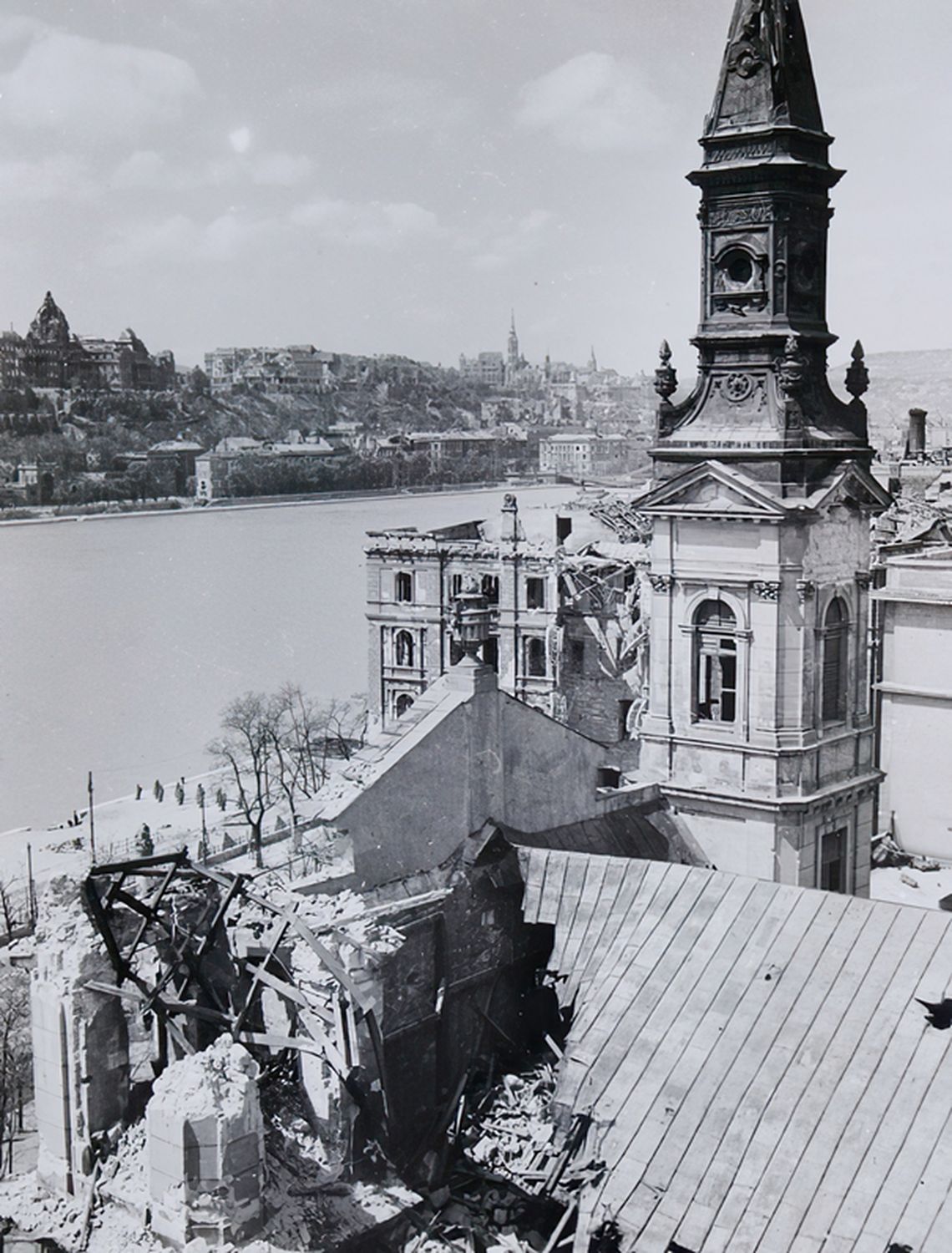 A 20. század közepén azonban mindez egyik pillanatról a másikra megváltozott. Budapest 1944-45-ös ostroma során az épület közvetlenül a harcok színterére került. A Duna két partjáról érkező orosz és német tüzérségi tűz súlyos károkat okozott. A hajó déli oldala sem kerülte el a pusztulást, a belső térben repedések, omlások és égésnyomok jelentek meg. A déli torony több találatot kapott és szerkezete olyannyira meggyengült, hogy összeomlott. Ezzel nemcsak egy építészeti elem tűnt el, hanem az a gondosan kialakított egyensúly is, amelyet az építészóriás, Ybl Miklós teremtett meg.
