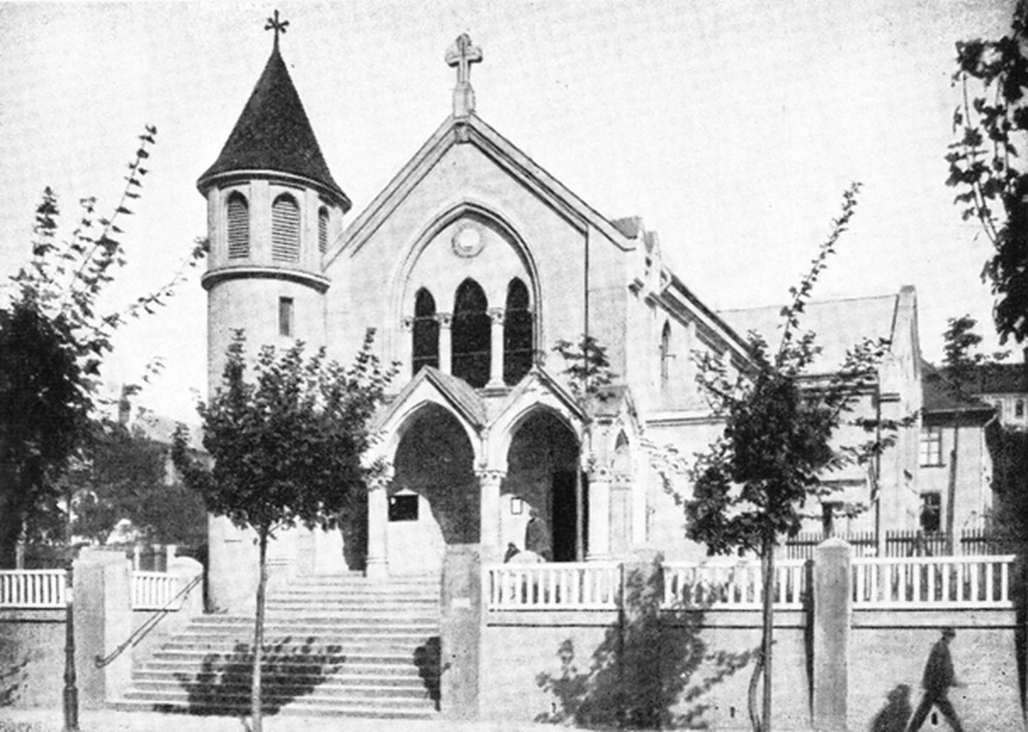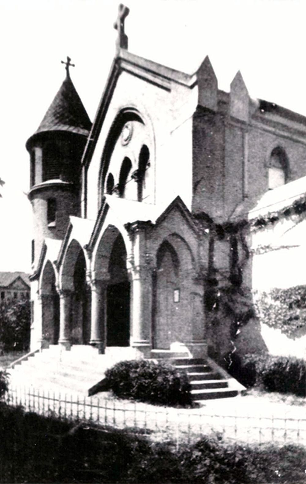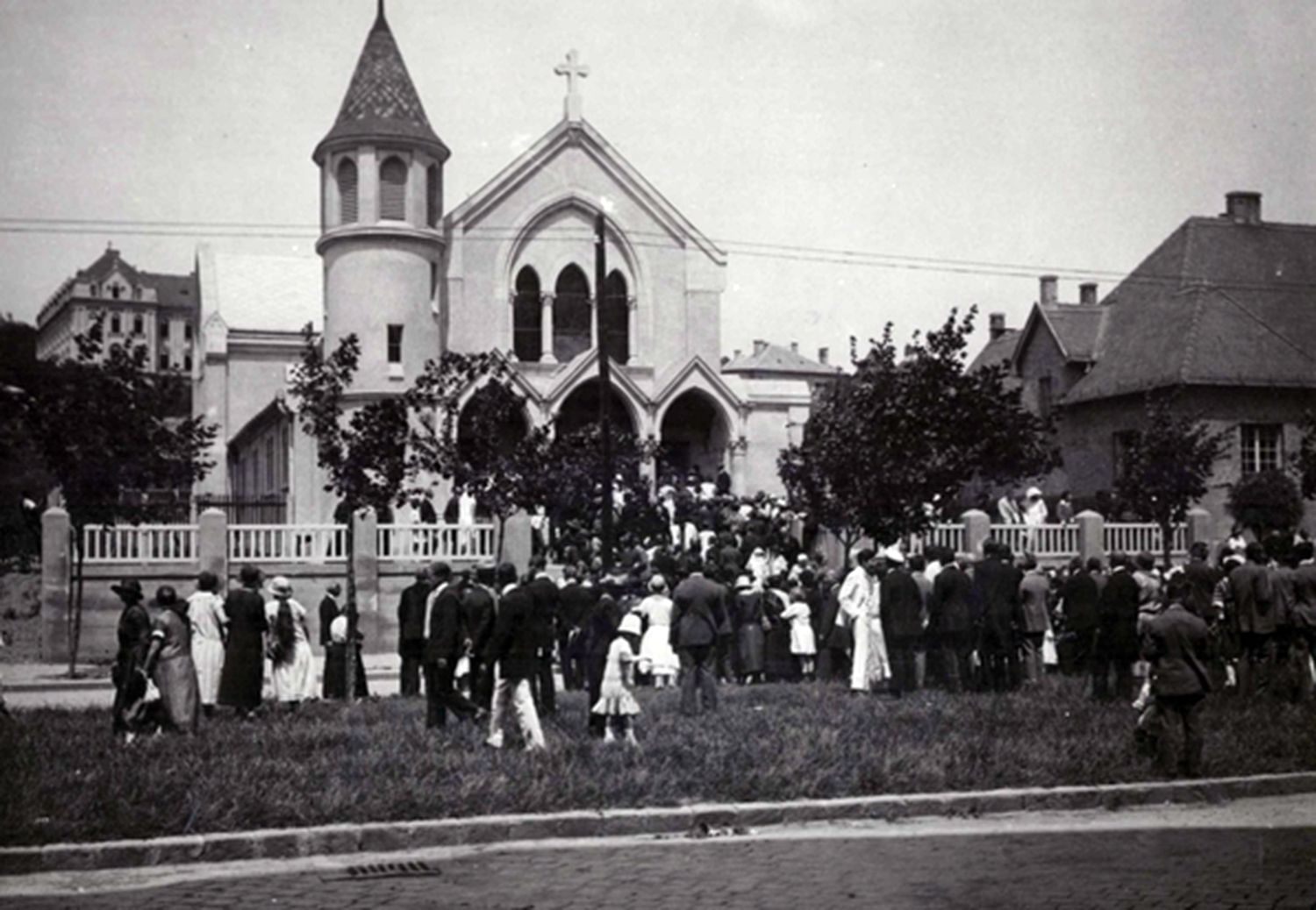 Vezetőkép: Az ideglenes templom a mai Villányi út 3. szám alatt. Jól megfigyelhető a járda melletti támfa és az abban kialakított lépcsősor, 1924. Forrás: Wikipedia