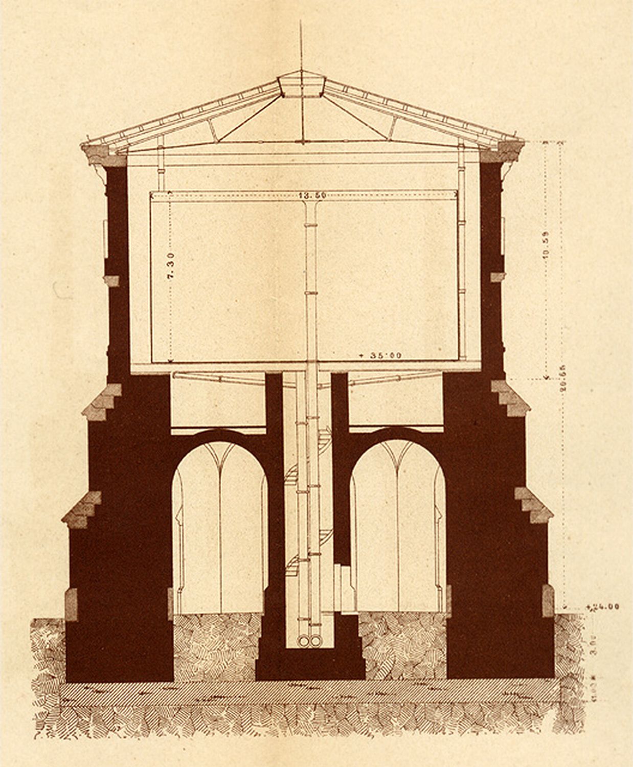 A torony belsejében egy hozzávetőleg 1000 köbméter befogadóképességű tartály helyezkedett el. A tartály alatti fővezeték a gravitáció elvét kihasználva juttatta el a vizet a környező városrészbe, biztosítva az egyenletes nyomást. A belső lépcsőrendszer hozzáférést adott a tartályhoz és az üzemeltetési szerelvényekhez. A környezet ekkor még ritkán beépített volt, így a torony messziről látható módon emelkedett ki a városszövetből.
