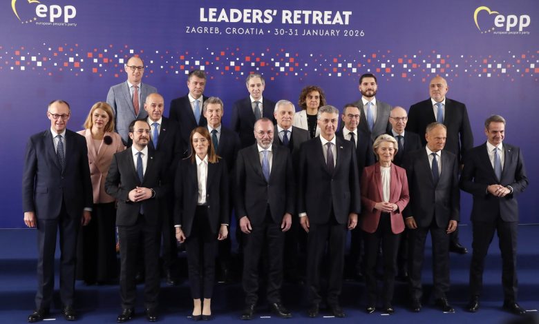 Vezetőkép: Csoportkép az Európai Néppárt (EPP) zágrábi informális találkozójának résztvevőiről 2026. január 31-én. Fotó: MTI/EPA/Antonio Bat