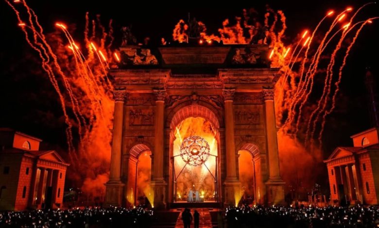 A szimbólum nem csak megjelent egy pillanatra, hanem elég hangsúlyos ábrázolást kapott, az Arco della Pace, azaz a híres milánói diadalívre volt kifeszítve a tűzvörös jelkép.