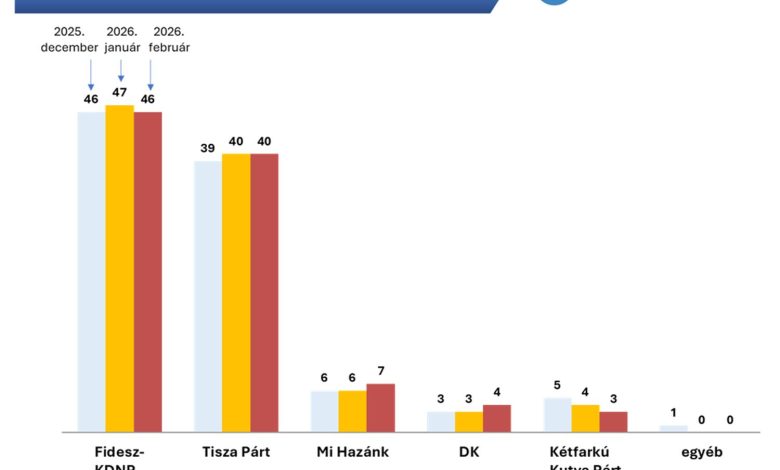 Befagyott a pártverseny a kampányidőszak elején: hiába a politikai érdeklődők által érzett intenzív választási küzdelem, annak hatása minimális. A Fidesz előnye kevesebb mint kilenc héttel a választás előtt is változatlanul jelentős, s egy most vasárnapi választás legvalószínűbb listás eredménye szinte megegyezik a januárival. A Fidesz 46, a Tisza 40, a Mi Hazánk 7 százalékot kapna. A DK is újra kopogtat a parlament ajtaján, 4 százalékos eredményével – közölte a Nézőpont Intézet pénteken az MTI-vel.