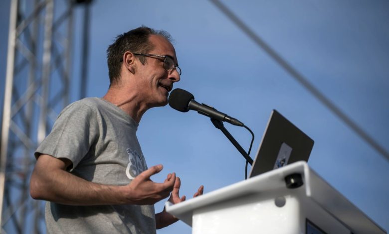 Vezetőkép: Kovács Gergely, a Magyar Kétfarkú Kutya Párt (MKKP) társelnöke, a főváros XII. kerületének polgármestere beszédet mond a „Legyen mindenki egyforma!” mottóval megtartott „Szürke Békemenet” demonstráción a Hősök terén 2025. április 12-én. Fotó: MTI/Balogh Zoltán