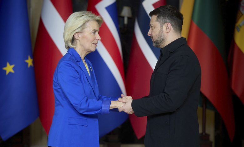 Vezetőkép: Az ukrán elnöki sajtószolgálat felvételén Volodimir Zelenszkij ukrán elnök és Ursula von der Leyen, az Európai Bizottság elnöke kezet fog az Ukrajnát támogató országok vezetőinek az Ukrajna elleni orosz háború kitörésének negyedik évfordulója alkalmából tartott kijevi találkozóján 2026. február 24-én. Fotó: MTI/EPA/Ukrán elnöki sajtószolgálat