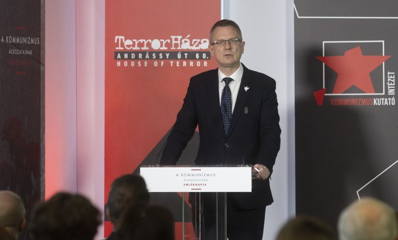 Vezetőkép: Rétvári Bence, a Belügyminisztérium parlamenti államtitkára beszédet mond a kommunizmus áldozatainak emléknapja alkalmából rendezett megemlékezésen a Terror Háza Múzeumban 2026. február 25-én. Fotó: MTI/Kocsis Zoltán