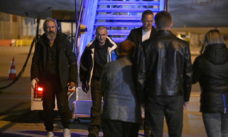 Vezetőkép: Szijjártó Péter külgazdasági és külügyminiszter és a vele Budapestre érkező két kényszersorozott kárpátaljai magyar hadifogoly a Liszt Ferenc Nemzetközi Repülőtéren 2026. március 5-én hajnalban. Fotó: MTI/Bodnár Boglárka