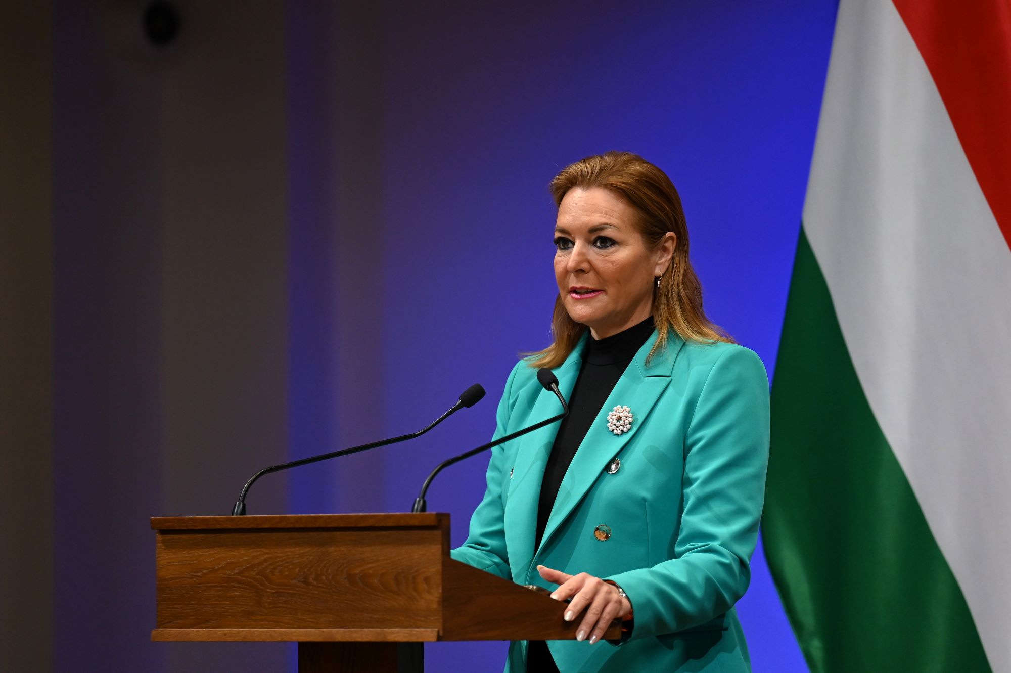 Vitályos Eszter kormányszóvivő a Kormányinfó sajtótájékoztatón a Karmelita kolostorban 2026. március 12-én. Fotó: MTI/Balogh Zoltán