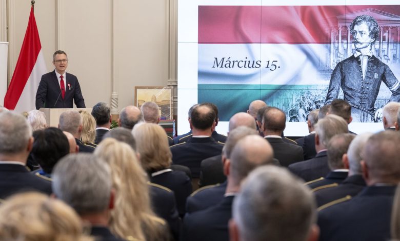 Vezetőkép: Rétvári Bence, a Belügyminisztérium parlamenti államtitkára beszédet mond az 1848-1849-es forradalom és szabadságharc kitörésének 178. évfordulója alkalmából rendezett ünnepségen a Belügyminisztériumban 2026. március 12-én. Fotó: MTI/Lakatos Péter