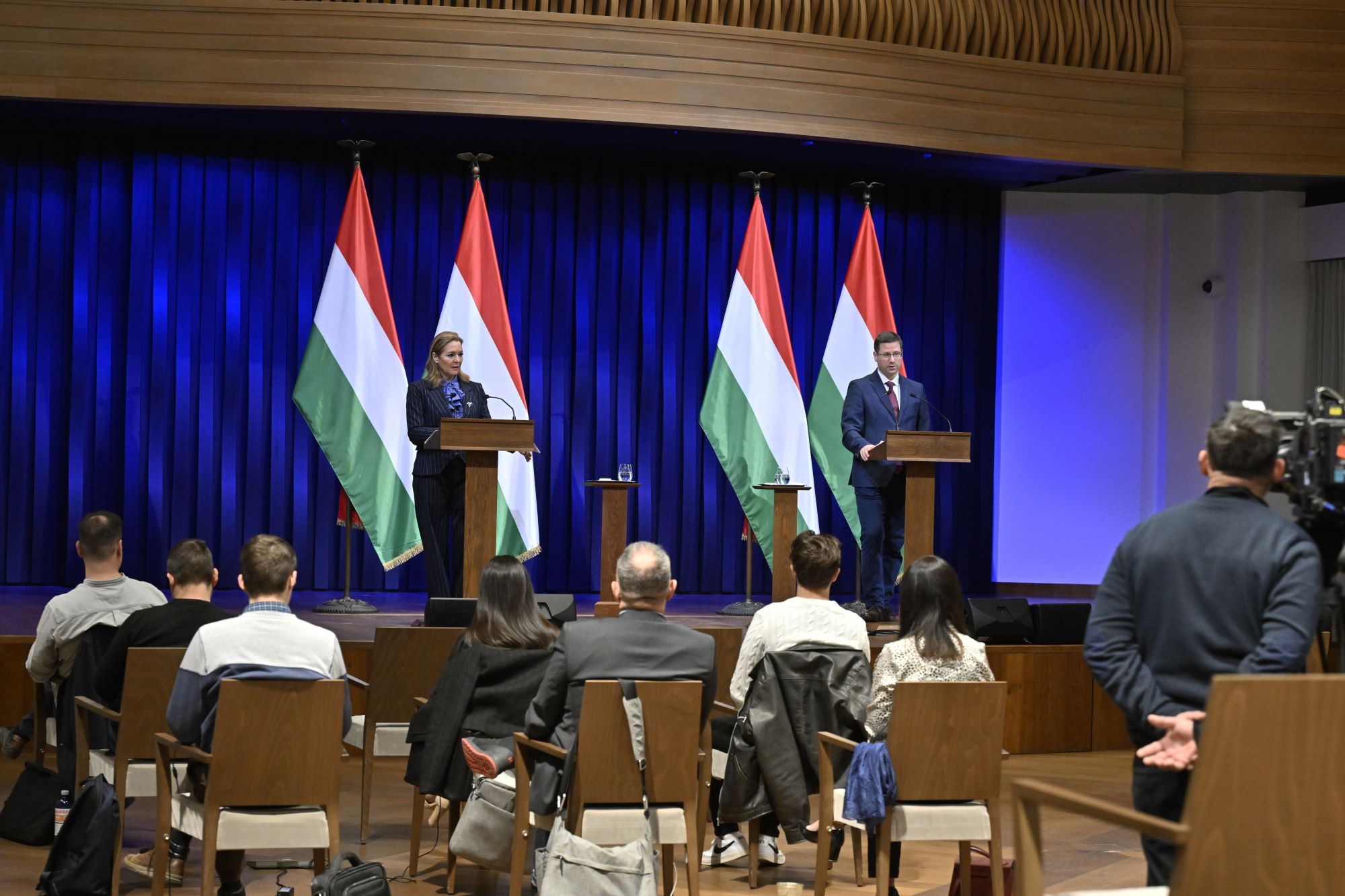 Gulyás Gergely, a Miniszterelnökséget vezető miniszter és Vitályos Eszter kormányszóvivő a Kormányinfó sajtótájékoztatón a Karmelita kolostorban 2026. március 19-én. Fotó: MTI/Máthé Zoltán