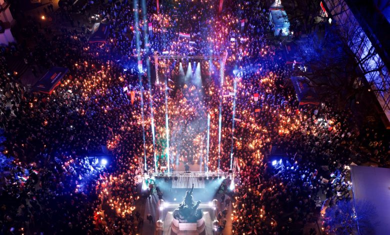 Vezetőkép: Orbán Viktor miniszterelnök, a Fidesz elnöke (k, lent) beszédet mond országjárásának egri állomásán, a Dobó István téren 2026. március 17-én. Fotó: MTI/Miniszterelnöki Kommunikációs Főosztály