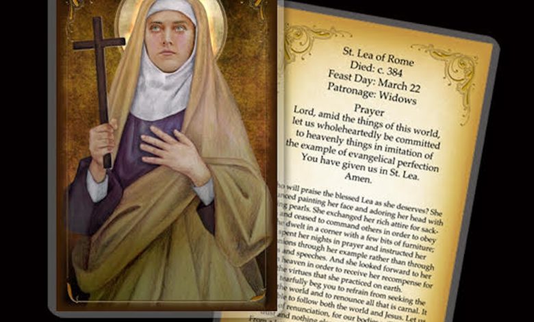 Szent Lea gazdag római özvegyasszony volt a IV. században. Férje halála után nem a világi fényűzésbe menekült, hanem teljesen Istennek ajánlotta életét. Lemondott vagyonáról, szerzetesi közösségbe lépett (valószínűleg egy aszkéta közösségbe, amely a korai római kereszténységben már létezett), és a legszegényebbek szolgálatát választotta.