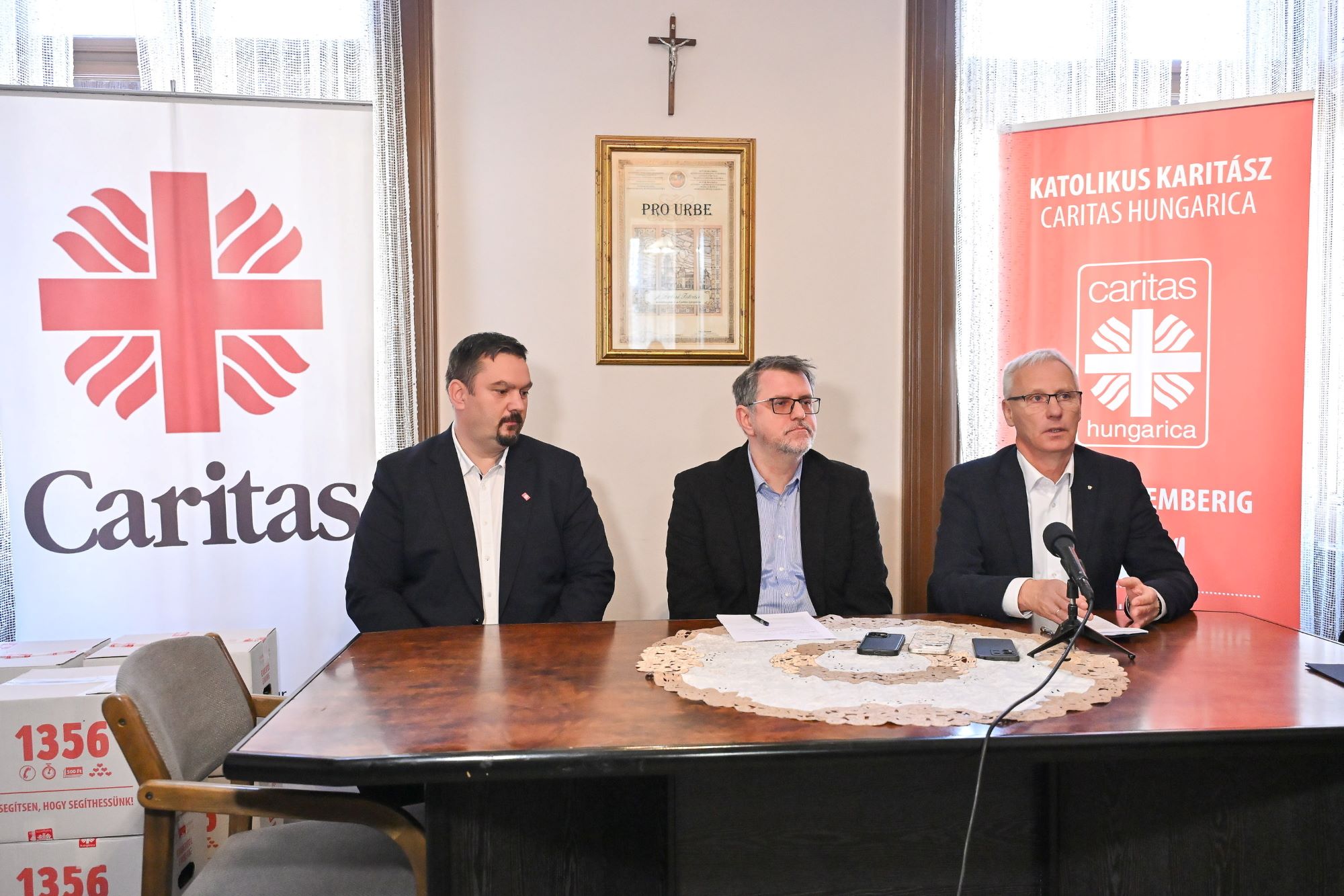 Soltész Miklós, a Miniszterelnökség egyházi és nemzetiségi kapcsolatokért felelős államtitkára, Zagyva Richárd, a Katolikus Karitász igazgatója és Paskó Csaba, a Caritas Szabadka elnöke (k) a Szabadkai Egyházmegyei Karitász központjában tartott sajtótájékoztatón 2026. április 1-jén. Fotó: MTI/Molnár Edvárd
