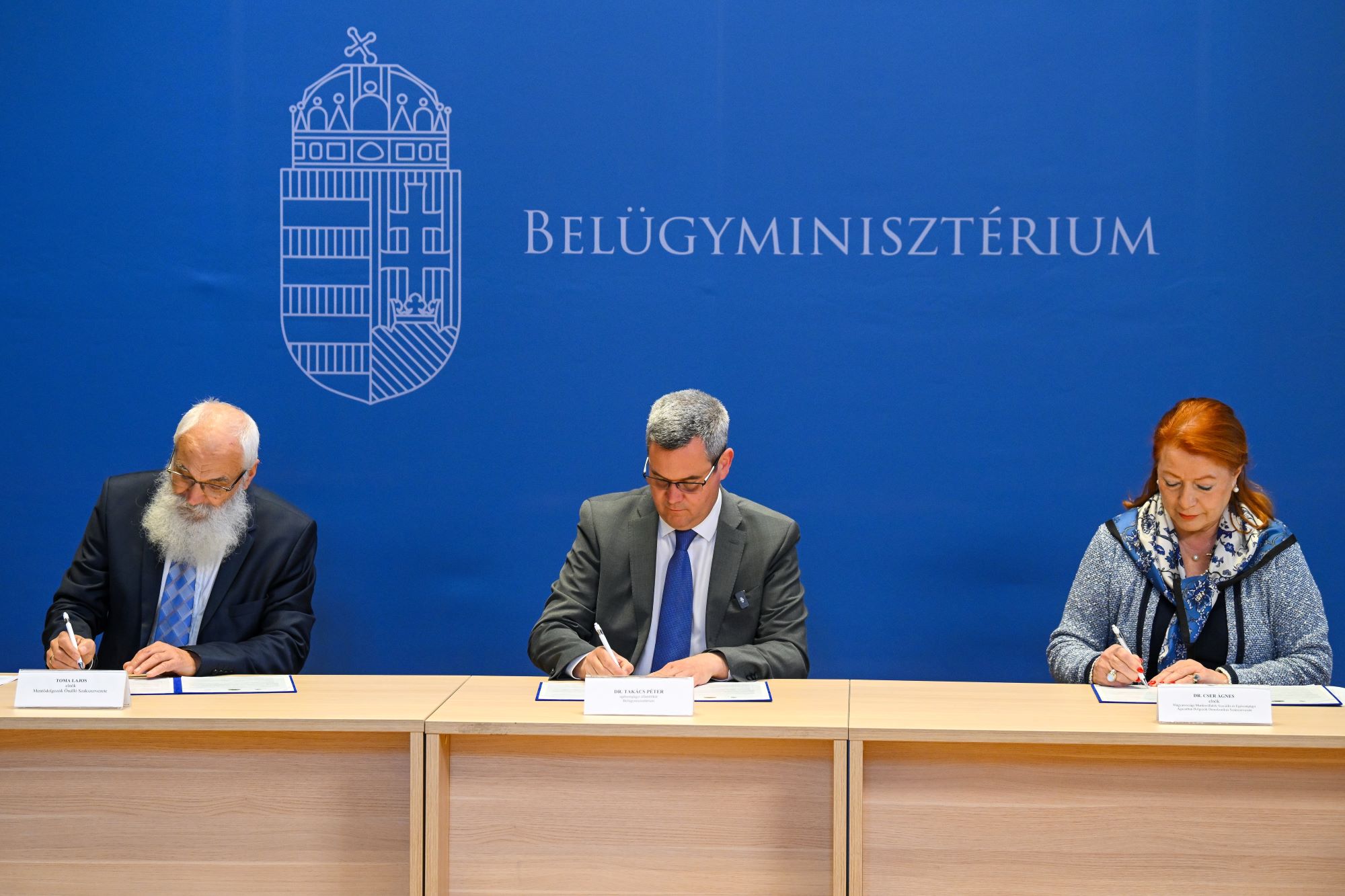 Takács Péter, a Belügyminisztérium egészségügyi államtitkára (k), Toma Lajos, a Mentődolgozók Önálló Szakszervezetének elnöke (b) és Cser Ágnes, a Magyarországi Munkavállalók Szociális és Egészségügyi Ágazatban Dolgozók Demokratikus Szakszervezetének elnöke aláírja a kormányzat stratégiai partnereivel az egészségügyi ágazatot érintő kérdésekben született megállapodást Belügyminisztériumban 2026. április 9-én. Fotó: MTI/Purger Tamás