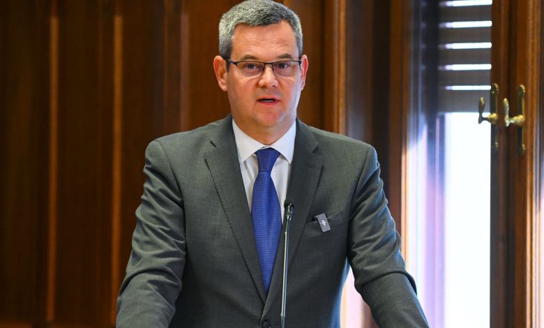 Vezetőkép: Takács Péter, a Belügyminisztérium egészségügyi államtitkára beszédet mond a kormányzat stratégiai partnereivel az egészségügyi ágazatot érintő kérdésekben született megállapodás aláírásán a Belügyminisztériumban 2026. április 9-én. Fotó: MTI/Purger Tamás