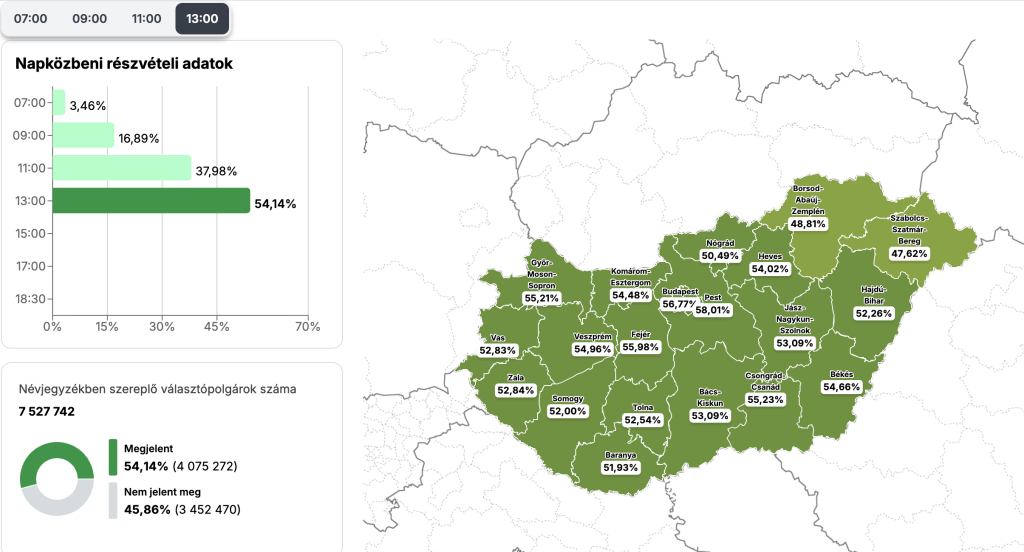 A választásra jogosultak 54,14 százaléka, 4 075 272 szavazó járult az urnákhoz a vasárnapi országgyűlési képviselő-választáson 13 óráig a Nemzeti Választási Iroda (NVI) adatai szerint.
