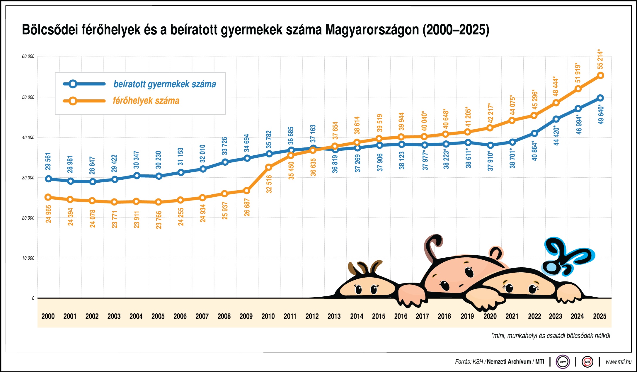 2020-tól azután meredeken emelkedni kezdett a bölcsődei férőhelyek száma Magyarországon, 2024-re ez a szám már túllépte és jócskán meg is haladta az 50 ezret, tavaly pedig már 52 214 férőhely volt. Így jelenleg is több bölcsődei férőhely van az országban, mint amennyi beíratott gyermek. Mindez úgy, hogy a beíratott gyermekek száma is szinte folyamatosan nőtt, a 2025-ös adat: 49 640 gyermeket mutat.