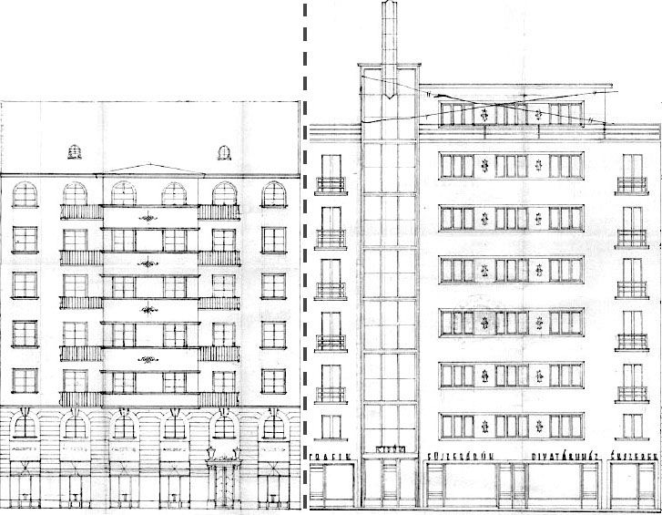 A baloldali homlokzatot Weisz Sándor, míg a jobboldalit ifj. Paulheim Ferenc tervezte. Végül Paulheim modern elképzelése érvényesült. Forrás: www.margitkrt5153.hu