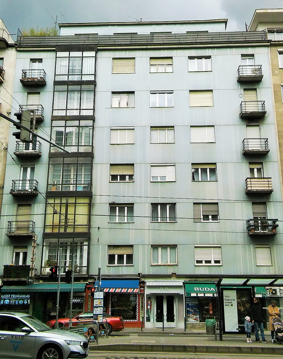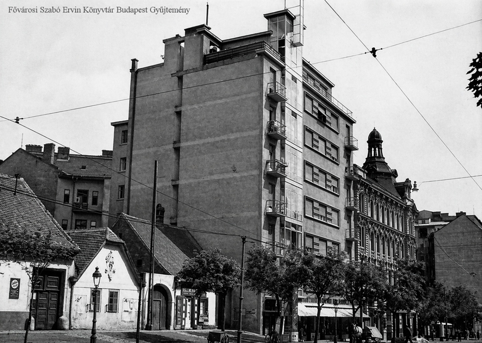 Az 1960-as fényképen a bérház még eredeti homlokzati díszeivel, de már visszabontott üvegtoronnyal látható. Forrás: Fortepan / Budapest Főváros Levéltára.