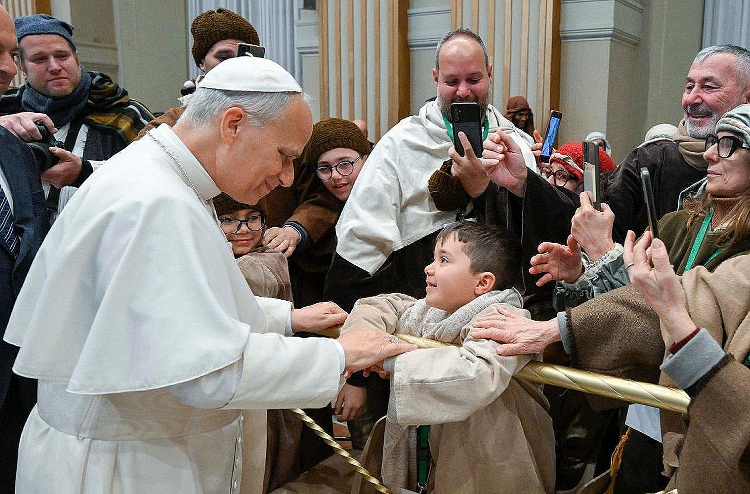 Leó pápa az élő betlehemi jelenetek résztvevőivel találkozott